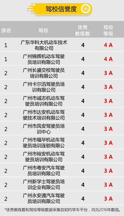 红榜中这些驾校信誉较高,基本是3A、4A级别。2016年,优秀教练数量红榜上有4家驾校为4人(最多),2家为两人。通过率方面,10家驾校中有7家驾校多次出现在科目通过率前十,说明学员培训质量较高,因而获得较多加分。