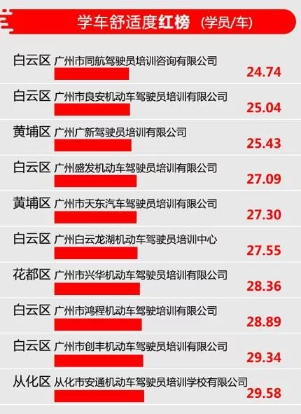 在学车舒适度红榜上,广州市同航驾驶员培训咨询有限公司排名第一,2017年上半年单车学员为24.74人/车,而2016年上半年该数值为43.16人/车,每车学员少了近20人,因其在培学员数量从4187人锐减至2400人。
