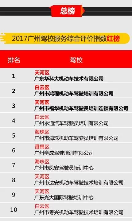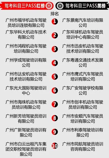 相比去年总榜前十,华科大、学成等6家驾校依然维持较高水平服务,今年继续稳守红榜。4家驾校今年跌出红榜各有不足之处,如广州市利泰驾驶培训有限公司今年的科目三通过率令人失望,拉低得分。