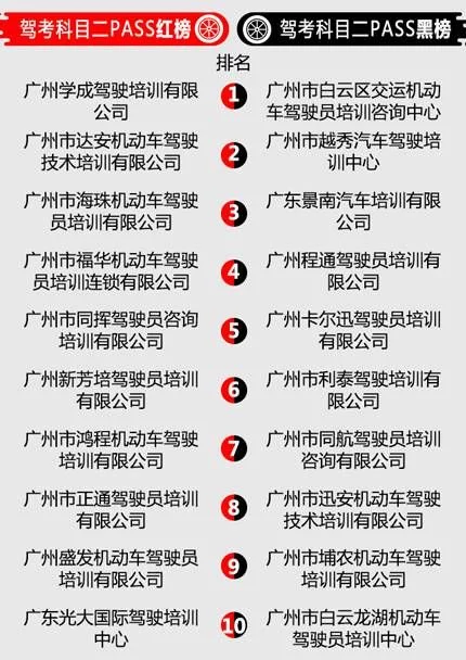 科目二PASS度黑榜,广州市白云区交运机动车驾驶员培训咨询中心、广州卡尔迅驾驶员培训有限公司等两所驾校的科目二考试合格率均有11个月位居全市驾校后10名,均低于53%。其中,通过率最低值出现在2017年2月,广东粤通交通技术发展公司只有33%。