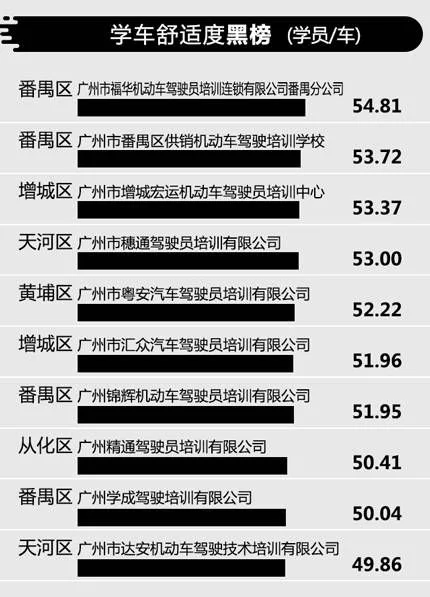 学车舒适度黑榜上的10家驾校,单车学员数量均超过49,这么多人一辆车练习,确实考验耐心。10家驾校中,番禺占了4家,而所有区驾校单车学员数量均值,番禺也以45,75人/车排名最后。